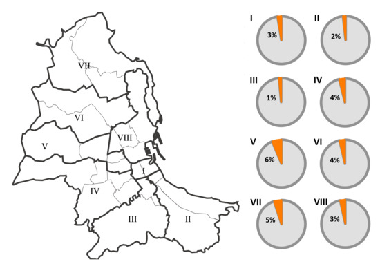 The population and the population density in the eights districts of Palermo are described in Table 2. Figure 2 shows the location of the public housing on sale in 2016 and the sold public housing from 2016 until May 2018 in the eight districts of Palermo, whereas Figure 3 shows the percentage of public housing sold in the same years.