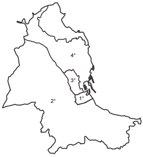 Table 3 shows the calculation of the political prices for all the public housing sold according to the cadastral zones (Figure 4), categories and classes to which they belong. In particular, the baseline price indicates the maximum political price, whereas the price indicates the minimum price that includes all the possible reductions by law. The maximum baseline prices are 452 and 497 euros/sqm for the highest cadastral category and class of public housing located in the central or wealthy districts, whereas the minimum political price is 106 euros/sqm for the housing located in the historical centre or in semi-peripheral districts.