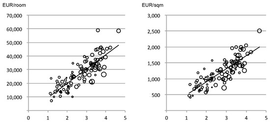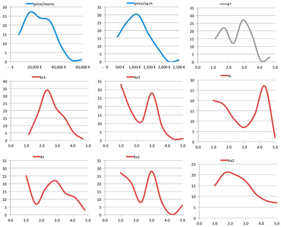 A similar further aggregation aimed at synthesizing the qualitative value of the surveyed units by an overall score (), provides an early profile of the relation between the current price and value (characteristics) in that area, by using the weight system calculated with the multiple regression method as explained in the next section: