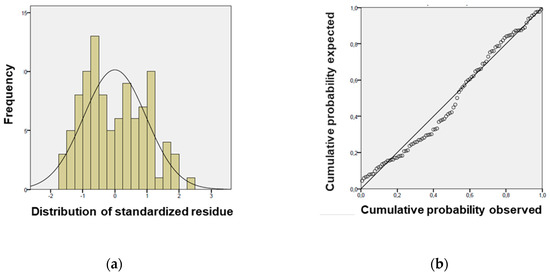 Figure 8. Distribution of the standardized residue (a, left); normal P-P graph of standardized residual regression (b, right). - The plots of the residuals standardized with respect to the explanatory variables of the model are characterized by a cloud of points arranged randomly (Figure 9 and Figure 10).