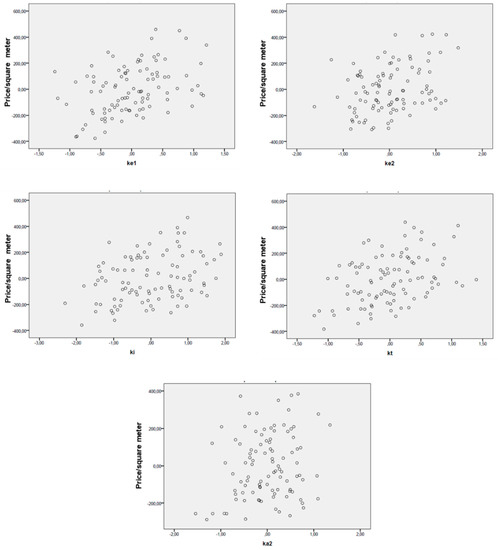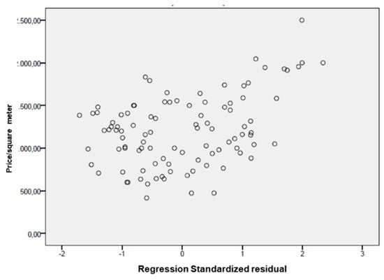 The multiple regression model is a statistical tool widely used for economic and estimative purposes [43,44,45]. The regression model establishes a correlation between the market value, or income, and characteristics like urban location [46], location within the building, technological condition, and architectural and environmental quality [47] that most significantly affect them, in order to express the mutual correlations between the characteristics and the quantitative effect produced by each characteristic on the price.