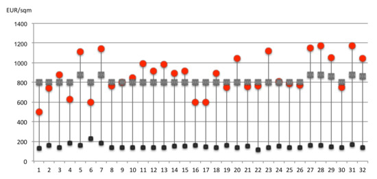 Comparison between political prices (black square), estimated market prices (red circle), and OMI prices (grey square) of the 32 dwellings (unitary price euros/sqm).