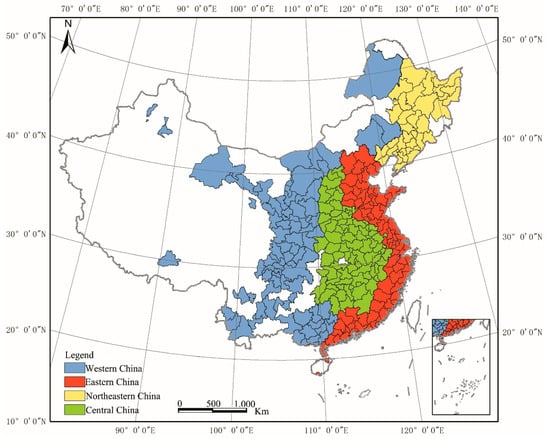 In 2010, China was composed of 337 prefecture-level units, including 287 prefecture-level cities, 50 regions, autonomous prefectures, and alliances. At present, the establishment criteria of prefecture-level cities include: (1) the population engaged in non-agricultural industries in urban districts is more than 250,000, of which more than 200,000 people are engaged in non-agricultural industries with non-agricultural household registration; (2) the total output value of industry and agriculture is more than 3 billion yuan, of which industrial output value accounts for more than 80%; (3) GDP is more than 2.5 billion yuan; (4) tertiary industry is developed and its output value exceeds that of the primary industry, accounting for more than 35% of the GDP; and (5) local budgetary revenue is over 200 million yuan. With 48.57% of the land area, 93.90% of the total population, and 96.19% of the urban population in China, the prefecture-level cities account for 97.21% of the gross domestic product (GDP) [,]. As important carriers of regional strategy and policy, prefecture-level cities have played an increasingly significant role in the development of China’s economy. According to different economic management systems, China can be divided into four economic zones: East, Central, West, and Northeast, which include 87, 81, 85, and 34 prefecture-level cities, respectively. Figure 1 shows the location of the prefecture-level cities in China. There are obvious regional economic differences among the four economic zones. In 2010, the per capita GDP of the four economic zones in the eastern, central, western, and northeastern regions was 46,621; 24,503; 25,511; and 38,293 yuan, respectively. The per capita GDP of the eastern region was almost twice that of the central region.
