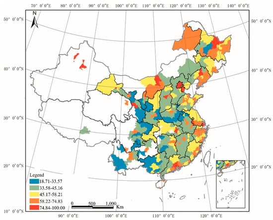 Figure 3 shows that the spatial differentiation pattern of China’s urbanization demonstrates dual characteristics: spatial agglomeration and administrative hierarchy. The higher the administrative hierarchy, the higher the level of urbanization. The spatial differentiation of urbanization largely occurs between coastal urban agglomeration and inland urban agglomeration. Specifically, the urbanization level of coastal prefecture-level cities is higher than that of inland prefecture-level cities.