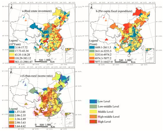 We selected a set of simple but important exploratory variables in relation to urbanization level. In this indicator system, capital is represented by one indicator: real estate investment, power is represented by the per capita financial expenditure, and the indicator that characterizes class is urban–rural income ratio. Urbanization rate refers to the ratio of urban population to total population. With the expansion and deepening of Reform and Opening-up, the force from ‘outside’ is gradually increasing []. Since 1978, the foreign capital inflows have changed the traditional process whereby the government is the major driver in the process of urbanization, especially in the Pearl River Delta region. Zhang [] also found that foreign direct investment (FDI) inflows contribute significantly to the differences in coastal-inland urbanization. Although globalization has gradually increased its impact on the urbanization process in China, China has a vast territory, and FDI is seriously unevenly distributed in the eastern, central, and western regions. FDI is largely concentrated in the eastern coastal areas, which is an important driving force for its urbanization process. The vast central and the western regions have attracted less FDI, which has had little effect on their urbanization. Therefore, China’s urbanization process is still mainly an endogenous process [], largely relying on endogenous production input, the domestic consumer market, and its own social development []. REI and FDI have a strong collinearity, which is also an important reason why we did not choose FDI as the explanatory variable. Variable meanings and basic statistics are listed in Table 1. The reasons for selecting variables are provided in the following sections.