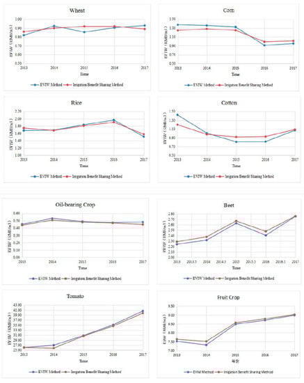As shown in Figure 2, on the whole, the EVIW values for the eight main crops based on the EVIW model were close to those of the traditional irrigation benefit sharing method and the errors between the two results for corresponding years are quite small. Only the estimation results of corn and cotton by these two estimation models (methods) had slightly more significant errors, with the highest values of 10.0% and 18.7% respectively in 2013. The error intervals for other crops were generally less than 5%. Except for wheat, the EVIW variation trends of other seven crops by using the two estimation models were very close to each other. The degree of coincidence is very high. Because of the specific value of the irrigation allocation coefficient, the estimation variation range of irrigation benefit sharing method is smaller than that of EVIW method. As in this study the field experiment method was used to estimate the irrigation benefit sharing coefficients and the average values of the experimental observations were used as the unified values of the case interval, the estimation results were relatively more stable for the irrigation benefit sharing method than the EVIW method. Regarding the latter method, the estimation results for each year were more independent. In addition, the variation ranges of estimation results between adjacent years for wheat, corn and cotton were relatively larger than those for other crops. As the average irrigation water price in Yanqi basin from 2013–2017 was 0.085 RMB/m3, it can be seen that the economic value of all crops exceeded the average water cost.