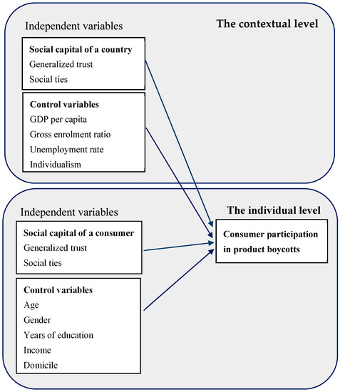 When describing the effects of social capital on consumer participation in product boycotts, the study distinguishes between social ties (hereafter also called social networks) and generalized trust (hereafter also simply called trust), because they are the key components of social capital [24]. Given that social capital can be considered at different levels [23], the role of each component of social capital is explained at the individual and contextual levels.