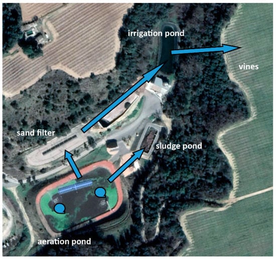 The water used by the Viñas del Vero winery is not discarded. All the water used for the processes taking place in the winery is transferred to a WWTP. Finally, the water is used for irrigation in the vineyard. An aerial view of the facility is shown in Figure 1.
