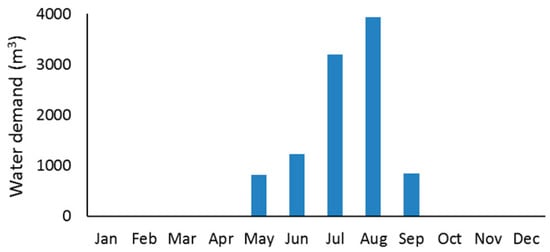 By contrast, the seasonal profile of the demand and its manageability is not so obvious, because of its dependency on agricultural criteria for irrigation. The vine, like other Mediterranean crops, has traditionally been cultivated with rainfall as the only source of water. Some decades ago, drip irrigation was introduced in the vineyards of Spain and other countries. This trend is increasing, partly because the effects of climate change. In the Viñas del Vero vineyard, the volume of water needed is calculated each week, depending on the evolution of the crop, evapotranspiration, rainfall, etc. To know the profile of the irrigation demand throughout the year, historical data were used. The graph of an average year is shown in Figure 2. It is shown that the irrigation season begins in May and ends in September, with its maximum in August. For more than half of the year, the demand is zero.