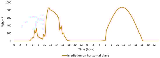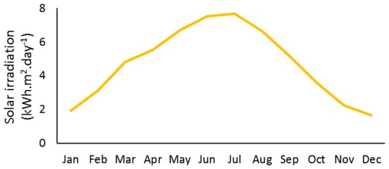 For the seasonal irrigation of Mediterranean crops, previous studies have shown, as in this case, that the ideal renewable generation is photovoltaics [13]. Data of the solar resource at the location (42°03′36″ N 0°05′42″ E) have been obtained from the Photovoltaic Geographical Information System (PVGIS) [21]. In addition, on-site measurements, before and after the installation of the prototypes, have confirmed the validity of these data. The solar irradiation on the horizontal plane is shown in Figure 3. Regarding the wind resource, the available data and measurements showed that it was scarce, with long periods of calm, even during several successive weeks. It also had strong variations from one year to the next. As a result, the solar resource suits the profile of the energy demand a lot better than the wind resource, resulting in a generation mix, with 100% of photovoltaic. For all these reasons, photovoltaics is the only kind of renewable generation used in the standalone RES of the present case study.