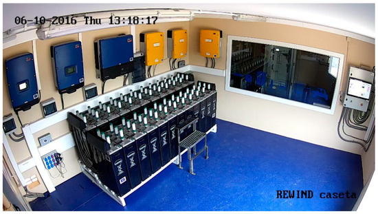 A battery of this size is relatively small and does not meet the minimum recommended by the inverter manufacturer, which was 100 Ah per kWp of the photovoltaic panels. That is, for the 43.2 kWp of the photovoltaic set, a minimum of 4320 Ah would be appropriate, rather than the 2680 Ah that was chosen. This recommendation seems to be designed to avoid charge rates above C5. However, in the design of the prototype, it was decided not to comply with this manufacturer’s recommendation. That is, the battery incorporated into the prototype is 2680 Ah C10, which corresponds to 128.64 kWh. To limit the charge current of the battery, the difference between the power produced and consumed has been limited as explained in Section 2.4.2.