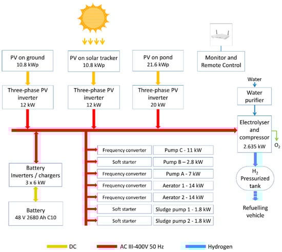 The room of the inverters, batteries and control devices is shown in Figure 5. The pumps and aerators require a supply of three-phase AC 400 V 50 Hz. In addition, one of the design criteria was the use of energy simultaneously with its production, avoiding its storage whenever possible. For these reasons, it was decided to use an AC bus, to which both solar inverters and battery inverters are connected (Figure 6). In this way, the alternating current from the solar inverters can go directly to the loads, reducing conversion losses. Another advantage is that solar inverters have a higher performance than solar chargers. Each of the three photovoltaic assemblies has its own three-phase solar inverter, with a total power of 44 kW.