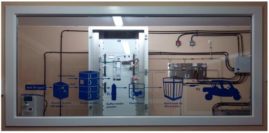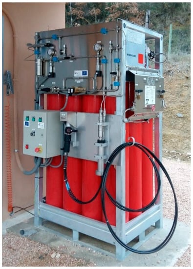 Certainly, one of the main challenges to avoid the use of diesel in agricultural machinery is the limited energy density of the batteries. Taking into account the demonstrative function of the prototypes, it was decided to use not only electricity, but also hydrogen as an energy vector, to extract the surplus energy from the RES and supply it to an off-road vehicle. For this purpose, a hydrogen production system (Figure 7 and Figure 8) was added to the RES, including a water purifier, an electrolyser, a compressor, a storage tank and a refuelling mechanism. A specific article focusses on this system [24].