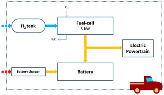 - Roda, V.; Carroquino, J.; Valiño, L.; Lozano, A.; Barreras, F. Remodeling of a commercial plug-in battery electric vehicle to a hybrid configuration with a PEM fuel cell. Int. J. Hydrogen Energy 2018. [Google Scholar] [CrossRef]