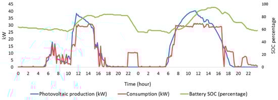 Regarding the battery inverters, a set of three units maintains the three-phase bus at 400 V 50 Hz. They are also responsible for managing the battery. Its power will determine the loads that can be activated in the absence of photovoltaic production, for example, at night. These are the irrigation pump (Pump C), the heat pump, the control system, and in some instances, Pump B, which totals a maximum of 16.02 kW. The total continuous power of the selected battery inverters is 18 kW, although they can maintain a higher power for a limited time. In the opposite direction, the set of the three battery inverters cannot charge the battery to a power greater than approximately 20 kW. That is, although solar inverters can produce up to 44 kW, no more than 20 kW can be dispatched to charge the battery. This is due to the under sizing of the battery, following the strategy in which the energy goes from the solar inverters to the loads in the largest possible proportion. Consequently, to avoid overcharging the battery inverters, when the solar production rises above 20 kW, one or more loads (for example, an aerator) must be activated to consume this excess. This is one of the criteria incorporated into EMS. In a conventional RES with the same photovoltaic power, it would be appropriate to incorporate a set of battery inverters of more than twice the power chosen here. In fact, the chosen sizing does not respect the recommendations of the manufacturer of the inverters, but this has been done intentionally to show how it is possible to drastically reduce the size and the cost of the short-term storage subsystem.
