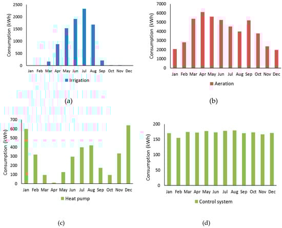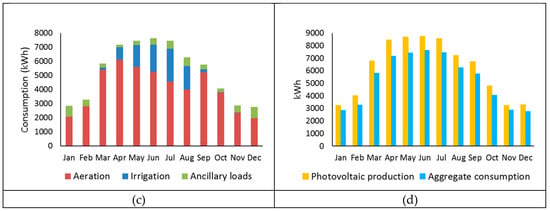 The aggregate consumption, including all loads, except the production of hydrogen, which is fed by the surplus energy, is shown in Figure 14c. This presents a very similar profile to that of photovoltaic production. The seasonal profile of the aerators is a consequence of the management carried out by the control system, according to the EMS, as explained in Section 2.4.6, adapting the consumption to the available energy. As a result, the consumption is well suited to the demand, taking advantage of the available energy and adopting a very similar annual profile, as shown in the Figure 14d.