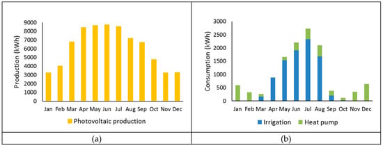 Graphs of the aggregate consumption of the loads have been obtained, which are to be compared with photovoltaic production. The irrigation and heat pump have different seasonality. Both consumptions are priorities, and none of them has been deferred in the medium or long term. On the one hand, the maximum of the heat pump occurs in winter, when the demand for irrigation is zero. On the other hand, the maximum of the irrigation coincides with a relative maximum of the heat pump, but also with the maximum of photovoltaic production. The aggregate consumption of both is shown in Figure 14b. This combination approaches the profile of production better than the loads considered individually.