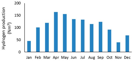 The energy that is not used simultaneously with the production is stored in the battery. Once the SOC is very high, the control system dispatches the surplus energy to produce hydrogen. Some parameters of the hydrogen production system are shown in Table 9. As a result, over the year studied, the system produced 1290 Nm3 of hydrogen, which incorporates 3870 kWh of energy. The volume of hydrogen production, by month, is shown in Figure 15.