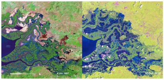 Today, more than 50% of the terrestrial planet has been transformed by human activities [40]. To feed the increasing population and produce more meat, large stretches of forests are being cleared and converted into cropland and pastures [41]. Between 2010 and 2015, 11 million ha of forest were cut down, mostly for conversion to crop land [42]. The largest deforestation occurred in Amazonia, Borneo and the Sumatra islands (Indonesia), and in Africa, as well as in the boreal forests of Canada and Russia. More than half of the world’s mangroves have been cleared, often for conversion to fish/shrimps farms (see the example from Honduras in Figure 1).