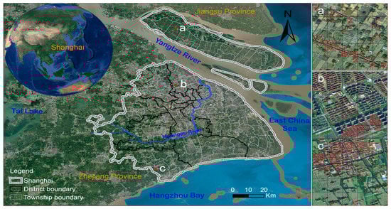 Location of Shanghai and comparison of the building footprint (red polygon in a, b and c) and aerial image (from Google Earth) in three selected areas (a, b and c). The building footprints in both a and c are relatively consistent with the actual building distribution as reflected by the aerial image, both of them being located in a less-developed region with mainly low-rise buildings. For area b, the building coverage from the building footprint maps underestimated the actual building-occupied areas due to their missing the building footprints for some high-rise buildings.