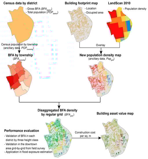 The most consistently reliable exposure data are usually available at the administrative unit level. Previous studies have used various disaggregation methods using ancillary data to generate exposure data sets for natural disaster risk assessment, rather than simply assuming an equal spatial distribution of assets over the whole administrative area, particularly focussing on mapping of population density []. Several ancillary data sets have been used for building asset disaggregation. Dutta et al. [] used gridded land cover data to disaggregate building exposure data that was estimated at a ward-level. The building floor area (BFA) per grid cell was determined using land cover types, the percentage of area covered by buildings in a given area, and the ratio of the gross BFA divided by the ground area of the buildings. The latter two parameters were usually unavailable in census data. Seifert et al. [] used land-use data and building density fraction information to disaggregate assets into different economic sectors. By comparing three different disaggregation methods and two land-use datasets in the framework of flood damage estimation, Wünsch et al. [] concluded that investing in land-use data quality could be better than in more sophisticated mapping techniques. Population distribution is also a widely-used proxy variable for disaggregating the building asset values from the census area to a finer resolution []. Thieken et al. [] assumed that the population distribution directly reflected the distribution of residential asset values, as they found a direct correlation between the two, and therefore, they used population distribution data and land cover data as ancillary variables. Silva et al. [] used the LandScan population distribution to disaggregate the building stock at the parish level for a disaster risk assessment in mainland Portugal. Figueiredo and Martina [] directly used open building data, including building footprint and height, to disaggregate census data to a gridded residential BFA data set. However, a limitation of many of these previous studies is that exposure model validation is rarely performed, largely due to data scarcity for most existing study areas.