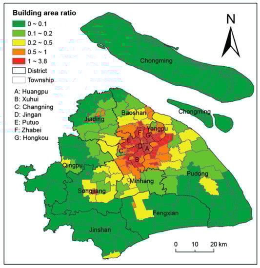 This study uses three types of data (Table 1). First, the census data of Shanghai, including district-level and township-level total population data, the district-level total BFA data subdivided by both height class and building use type (Table 2), and the completed construction floor area and its cost of construction by building use type in 2014 (Table 3), are obtained from the Shanghai Municipal Statistics Bureau [,]. As shown in Table 2, the total population of Shanghai surpassed 24 million inhabitants in 2014. The gross BFA of Shanghai reached 1153 km2, and 53% of this BFA corresponded to residential buildings. Among the building height classes (Table 4), buildings with 1–7 storeys (low-rise buildings) represent 68% of the total BFA, buildings with 8–19 storeys (medium-rise buildings) represent 21%, and only 11% of the BFA corresponds to buildings with more than 20 storeys (high-rise buildings). Second, vector data, including a building footprint map of Shanghai, which provides information on building location and area, are obtained from the Map World of Shanghai (www.shanghai-map.net). This data is generated from high-resolution remote sensing data by the Shanghai Municipal Institute of Surveying and Mapping for 2013 and 2014. In contrast, actual building height data in the downtown area, which provide information on building height, area, and location, are acquired by field surveying with the help of aerial images. Third, raster data, including LandScan population density grids (30 arc seconds) in 2010 are developed by the Oak Ridge National Laboratory [,] (as shown in Figure 2).