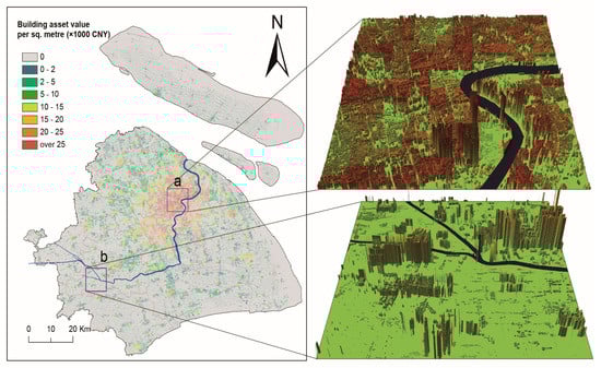 In the research field of disaster loss estimation, there is an important distinction between methods for the valuation of assets at risk. Researchers either use replacement costs or depreciated values within their loss calculation methods [,,]. The replacement cost can be interpreted as the cost of rebuilding a property exactly as it was prior to the disaster, regardless of any depreciation due to its age. This approach provides valuable information on potential pay-outs and is therefore interesting from an insurance perspective []. The depreciated value can be interpreted as the remaining property value, corrected for its depreciation by age [], and it is often assumed to be the true cost that is with the loss of the asset []. It is important to note that the depreciation value is lower than the replacement value. Given that flood insurance is still not well developed in China, especially in rural areas, governmental financial support usually guarantees the post-disaster reconstruction of an inhabitant’s house, moreover, the latest building code is usually adopted in post-disaster reconstruction, and the newly constructed buildings are usually safer than the old ones. As such, this paper uses the current construction cost (excluding the cost of land per square meter) to produce a building asset value map for Shanghai. Overall, the construction cost value should be equal to or greater than the replacement cost value because the former adopts the higher standards of the newer building code. This evaluation may have practical implications for the government in terms of disaster risk management (i.e., financing demand in post-disaster reconstruction).
