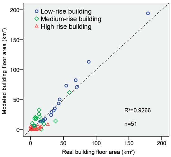 Second, to produce a more realistic building asset value map, this paper resorted to using LandScan population density data to derive the BFA density distribution information under the assumption that the per-capita BFA is the same within a township; as such, the disaggregated BFA is only valid up to a certain level of grid spatial resolution, which largely corresponds to the limit of the representativeness of the LandScan population density grid (800 m × 800 m) that is used to represent the BFA density distributions. Moreover, although we display the BFA map at a resolution of 2.5 m × 2.5 m (to retain the actual building location information), at higher resolutions, (i.e., when the grid cell size is smaller than 800 m × 800 m), the BFA distributions for each regular cell are meaningless. Meanwhile, using the average density distribution of the BFA within a grid cell size of 800 m × 800 m corresponding to the population density will cause smoothing of the building height, resulting in the underestimation of both the high-rise and low-rise BFA values in most districts (as shown in Figure 6). Using high-resolution remote sensing data (LiDAR data) to extract building height and urban structure [,] should avoid the use of the 2010 LandScan population density grid, this data is just a yearly average of population density, and gaps exist for the actual BFA distribution.