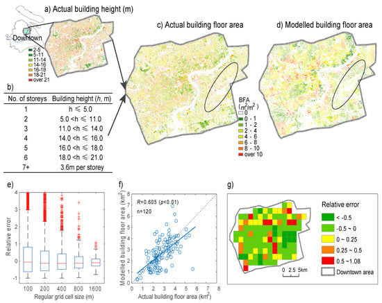 Furthermore, compared with the actual BFA distribution grid-by-grid in the downtown area, the variance of relative error of the modelled BFA decreases as the grid resolution decreases (Figure 7e). For example, when the regular grid resolution is 800 m × 800 m, the relative error of the modelled BFA (compared with the actual BFA density distribution) is mainly distributed in the range [−1, 1]. This variance is lower than that for the grid resolution of 100 m × 100 m (i.e., [−1, 3]). The modelled BFA is significantly correlated with the actual BFA at the 1600 m grid cell size level (Figure 7f), and the spatial distribution of the relative error is presented in Figure 7g.