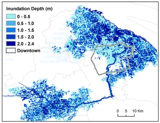 Although the maximum inundation depths in Shanghai are lower than 2.5 m for a flooding event characterized by a 10,000-year return period (Figure 8), and only the ground-floors (first floor) of buildings are directly affected by flooding, indirect flood effects may be induced, even though the building levels above the ground floor are not directly damaged []. For example, reduced housing service value may be incurred by flood-induced business limitations or disruptions, there may be disadvantages connected with reduced market and public services, and there might even be long-term building damage due to soaking or subsistence [,]. As such, flood exposure is defined in a broader sense in this study—that being the building stock that is located within the inundation extent, and not restricted to building assets that are directly affected (i.e., the ground floor of buildings) [].