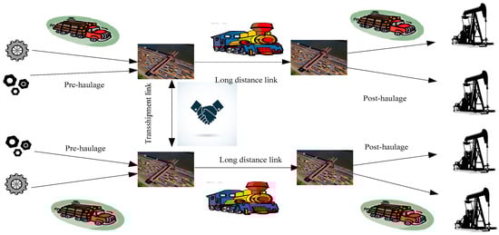 The suppliers of O&G drilling equipment usually distribute in different regions and produce one or serval kinds of equipment components due to the high personalization and specificity of the O&G equipment. Drilling sites usually located in regions with rich oil or gas resources. Drill sites usually need various equipment components to be assembled. In Figure 1, the components of the network include equipment suppliers, drill sites, transshipment, terminals and links in different transport stages (pre/post-haulage, transshipment link, long-distance link).