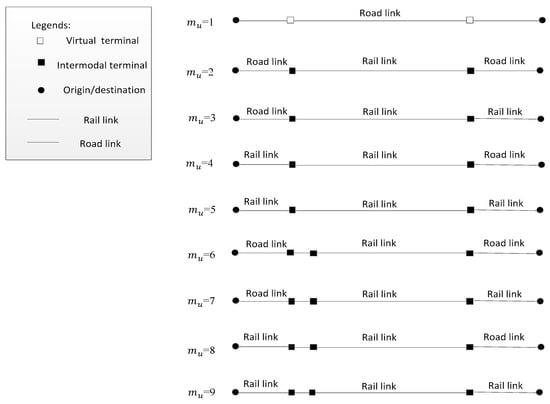 Let’s consider a case with one supplier and one drill site. Here we only consider two kinds of transportation modes, rail and road, denoted as u. There are nine alternative transport services illustrated in Figure 2, including unimodal road transport service ( = 1), traditional intermodal transportation services ( = 2, 3, 4 and 5) and collaborative transportation services ( = 6, 7, 8 and 9), where consolidation are made in some original terminals. Services = 1, 2, 3, 4 and 5 have three stages (links) ( = 1 have three stages with virtual terminals) and services = 6, 7, 8 and 9 have four stages (links). Here, we only consider rail transportation as the transshipment link and the long-distance link.