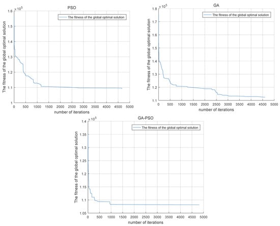 Among the results obtained using PSO, GA and hybrid GA–PSO in MATLAB, GA performed more poorly than the other two algorithms. The success rate is 20%, the processing time is 25 s. The Upon applying the hybrid GA-PSO, the results improved significantly compared to those obtained using the GA and PSO, in terms of both the minimum cost, the success rate and the processing time (Table 3). Figure 5 shows the fitness of the global optimal solution versus the number of iteration on these three kinds of algorithms. The iteration number of hybrid GA-PSO is 1000, which performs better than GA, while the same as PSO.