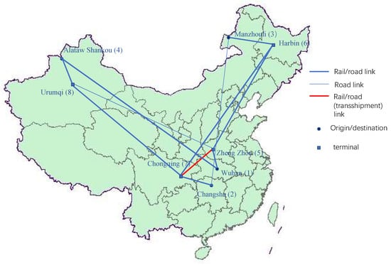 An intermodal freight transport network is established to cover the major cities which are suppliers of oil and gas equipment and Crexpress terminals along “The silk road.” Eight nodes are considered in the network (Figure 6). Wuhan and Changsha are chosen as the initial nodes because they are the major cities where oil and gas equipment enterprises locate. Manzhouli and Alashankou are the destination nodes, which are two main inland ports, where Crexpress pass and linked to Europe and central Asia. Zhengzhou and Chongqing are initial terminals where freight transfer and consolidate, Harbin and Urumchi are the destination terminals near the inland ports. The distance for each link is estimated from Geographic Information Systems (GIS). The estimates of the OD set demands (container flows) are based on an investigation for China Oil and Gas Industry Association and twenty-four oil drilling equipment companies located in Wuhan and Changsha (Table 4). The Crexpress Coordination Committee was established to make freight to be transported integrated into a platform. Here we assume that each transshipment terminal that located in the different provinces is serviced by one freight forwarder.