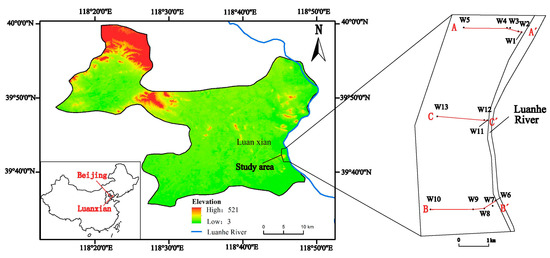 Our study area is located in the northeast of Luan county, Hebei Province, China. It is situated in the west of Luanhe River, the south of Yanshan Mountains, with a latitude 39°42′51″ to 39°45′03″ and a longitude 118°44′56″ to 118°45′54″ (Figure 1). Luanhe alluvial plain is a compound alluvial fan located at the front of the Yanshan Mountains, covering the northeastern part of the North China Plain. The study region is located in the front edge of the alluvial plain formed by Luanhe River. The elevation of the relief topography is between 20 m and 30 m. About 20% of the study area has been covered by forest, and 80% of it is covered by crops (wheat and corn). The area has a continental, semi-humid climate with an average annual temperature of 10.5 °C. Annual rainfall in this area is around 636.7 mm, and 86% of precipitation occurs from July to September. The mean annual pan evaporation is 1030.9 mm. The major surface water resource in the area is the Luanhe River. In Luan county, the river has a length of 41 km from North to South, a drainage area of 91 km2, and a streambed width of 700 m to 1100 m.