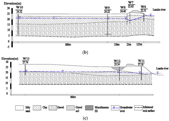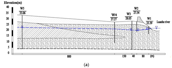 Based on the boring logs and high-density resistivity method, the stratigraphic structure at different cross section was identified. Sediments types include silty sand, clay, and gravel from the top to bottom (Figure 2). The sand layer and gravel layer are distributed continuously; however, the intermediate clay layer is discontinuous. The thicknesses of the silty sand, clay and gravel are about 1–7 m, 0–15 m and 8–23 m, respectively. In the vertical profile from the top to bottom, the particle size of various components is from fine to coarse, with a typical dual structure. The bottom of the sediments is bedrock, which is about 30 m below the surface based on the high-density resistivity method. The hydraulic conductivities of the layers are estimated based on the pumping test and slug test data. The permeability of the upper sand layer and lower gravel layer is high, and the hydraulic conductivities of these two layers are 1–6 and 100–350 m/day, respectively. The permeability of middle clay layer is relatively low, and the hydraulic conductivity of which is 0.01–0.1 m/day. The well W5 is located in a second-grade terrace, while the other wells are distributed in a first-grade terrace. The permeability of the layers increases with depth gradually. In the direction perpendicular to the river, the thickness of the silty sand and gravel become thin gradually, and that of clay increases. Therefore, the permeability of the aquifer near the river bank is greater, whereas it decreases far away from the river bank. Along the river longitudinally, from the upstream section A-A’ to downstream section B-B’, the thickness of sand and gravel becomes thin gradually, and the thickness of clay increases. Thus, the permeability of the layers has a decreasing trend from the upstream to downstream of the river.