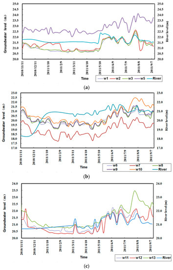 Temporal variations of the groundwater level observed in the wells along (a) transect A-A’, (b) transect B-B’ and (c) transect C-C’, respectively.
