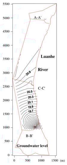 The drilling data of the thirteen monitoring wells show that there is a low permeable layer at the bottom of Luanhe river. The stream and multi-layered aquifer system can exchange water through the thin layer with low permeable material. Figure 3 shows the variations of the groundwater level observed in the wells and the stream level on the cross sections A-A’, B-B’ and C-C’, respectively. One can see that the observed groundwater level in the wells and stream level varied with seasons. During the dry season from November 2010 to April 2011, the observed groundwater level decreased slightly and the groundwater discharged to the river. Then, the groundwater level exhibited a gradually increasing trend from May to September 2011 during the period of river stage rise. In addition, from Figure 2, one can see that there are cones of groundwater depression in the vicinity of wells W2, W7 and W12, because there are a large number of wells for civil use with an amount of pumping more than 10 thousand m3 per day. Figure 4 shows the contour map of the average groundwater level in the study area. The groundwater level decreases from the section A-A’ to section B-B’. This indicates that the groundwater flow direction is from north to south, which is basically consistent with that of the river water.