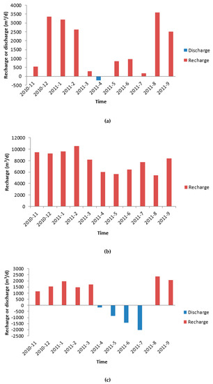 In order to investigate the interaction between river water and groundwater, the quantity of recharge from the river water to groundwater and that of discharge from groundwater to river water were calculated, based on the equation (1). Although groundwater flow paths in the riparian areas can be significantly more complex than simple vertical fluxes [38,39], it is still useful to compare river level with nearby groundwater level to determine if the reach is likely to be gaining or losing water [40,41]. The hydraulic conductivity of riverbed sediment was estimated to be 0.032 m/d based on the field test. The total length of the calculated river reach is 5.5 km. The length of each section was determined according to the distribution of seepage field. The calculated width is equal to half of the width of river, considering the symmetry. Based on the field investigation, the thickness of the bottom sediment is 0.6 m, 0.7 m and 0.8 m for the sections A-A’, B-B’ and C-C’, respectively. The river level is the level corresponding to each section. The groundwater level is equal to nearby groundwater level in each section (well 1 for section A-A’, well 11 for section C-C’ and well 6 for section B-B’). Therefore, the amount of recharge and discharge is estimated based on the river level and groundwater level according to the Darcy’s law. The amount of recharge and discharge in different sections are shown in Figure 5. From the figure, one can see that the river water recharges groundwater during most of time from November 2010 to September 2011. The amount of groundwater supplied by the river is 346.3 × 104 m3/a, and the discharge of groundwater to the river is about 14.08 × 104 m3/a during this period (Table 2).