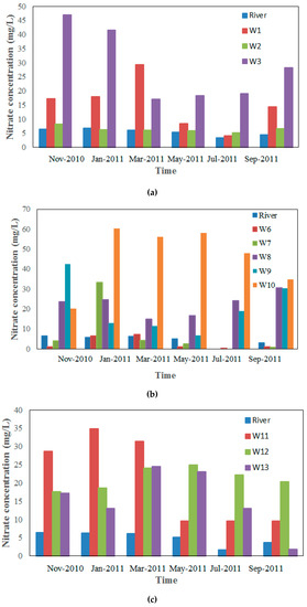 Similar to the transects A-A’ and B-B’, the average time of river water passing through the riverbed is 53 days in the transect C-C’. The average migration time of nitrate from the river to the zone of groundwater level depression cone ranges from 65 to 82 days when the effect of bottom sediments of the river is considered. Additionally, it can be seen from Figure 6c that there is obvious hysteresis in the nitrate transporting from the river to groundwater. The peak value of nitrate concentration in the river water in November 2010 corresponds to that of well W11 in January 2011 and that of well W12 in May 2011, respectively. Thus, the time lag for the migration of nitrate from the river to groundwater is two to six months, which is longer than that obtained by the analytical method. This is because the migration of nitrate is considered in the analytical method without considering the dispersion effect. However, without consideration of the effect of riverbed sediment, the migration time of nitrate from the river to the zone of groundwater level depression cone ranges from 13 to 20 days.