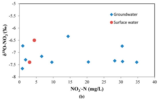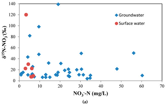 (a) δ15N-NO3 versus NO3−, and (b) δ18O-NO3 versus NO3− for groundwater and surface water.