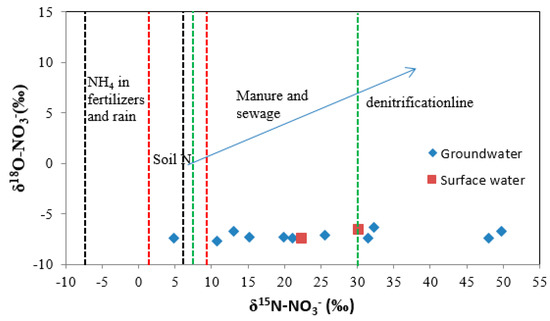 The values of 18O and 15N are listed in Table 3. The average standard deviation of normalized data is 0.3‰ for δ15N. Isotopic composition of nitrate in groundwater and river water showed seasonal variation. The range of δ15N-NO3 values was from 3.8 to 139‰ for groundwater and from 7.2 to 120.1‰ for surface water, showing a large variance. The maximum δ15N-NO3 value of 120.1‰ occurred at surface water in the transect A-A’ in July 2011, when the river NO3-N concentration was at its minimum. The δ18O-NO3 values ranged from −7.66‰ to −6.34‰ for groundwater and from −7.4‰ to −6.5‰ for surface water, with the mean values of −7.15 ‰ for groundwater and −6.95 ‰ for surface water. The highest δ18O-NO3 value occurred at well W1 in September 2011 (−6.34‰), while the lowest value (−7.66‰) of δ18O-NO3 was obtained at well W7. As can be seen from Figure 7, there was a tendency for both δ15N-NO3 and δ18O-NO3 to increase with N-NO3 concentration. According to the bi-plot of δ15N-NO3 versus δ18O-NO3 for potential nitrate sources, the isotopic signatures of nitrate in groundwater and river water fall within the window for sewage, livestock manure and natural soil organic matter (Figure 8). This indicates that a significant positive relationship was discernable for the whole dataset.