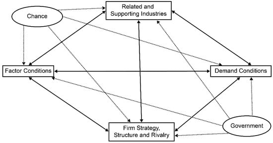 The diamond model represents a dynamic system in which interactions between factors strengthen one another. The elements of this system are “factor conditions”, “demand conditions”, “related and supporting industries”, and “firm strategy, structure, and rivalry”, while “government” and “chance” are important factors affecting these elements, as Figure 1 shows.