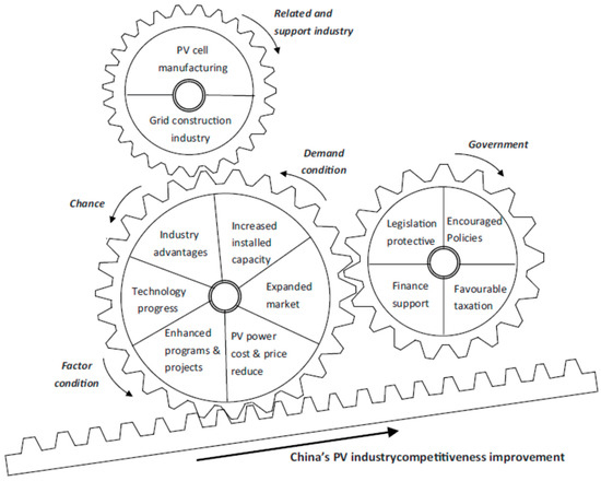 Zhen-yu Zhao [37] adopted the diamond model approach to analyze the factors affecting the competitiveness of the PV power industry in China and developed a gear model to highlight this process (as Figure 2). These factors are: solar resource potential, generation costs and on-grid power price, programs and projects, technology, overall market, installed capacity, on-grid PV systems, industry rules and industry competitions, PV cell manufacturing, grid construction industry, legislation, policies, financial incentives, taxation, industry advantages, and industry challenges. All of these factors affect the competitiveness of China’s PV industry from different angles. Similarly, the interactions between these factors form a joint force to improve the industry competitiveness.
