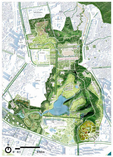 Healing: The Future Park, the winning scheme of the international competition, proposes a system where crops produced by urban farming within the park can be consumed by visitors at restaurants in the park [38]. The generation, supply, and consumption of new and renewable energy in the park can be also understood as a measure to create a resilient park. The concept of sustainable resource circulation was incorporated in the Yongsan Park master plan as the reuse of materials removed from the existing buildings, roads, and forest in the park [37].