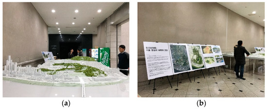 Yongsan Park exhibition in the War Memorial of Korea: (a) physical model of the park; (b) image boards explaining the park design and vision (photos taken by the authors).