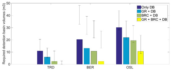 | Combined measures | No investigation | Comparison of: (1) Detention basin alone (2) Green roof and detention basin (3) Bioretention cell and detention basin (4) Green roof and bioretention cell and detention basin. Detention basin volumes needed |