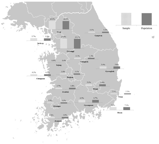 1000 households were surveyed, applying the contingent valuation (CV) method, during August 2018, in order to obtain an estimate of the additional WTP or the price premium. At the time of the CV survey, there were 19,751,807 households in South Korea [42]. Thus, one can question whether a sample of 1000 households can properly represent the population of about 20 million households. The authors think that the sample represents the population well in three points. First, the Blue Ribbon Panel Report of Arrow et al. [23] mentioned that 1000 observations could properly represent the population if scientific sampling was adequately performed. In order to represent the national population well, our sampling method was satisfied with random sampling. This was conducted to be similar to the population geographical distribution within 15 strata. Our sample was allocated to the provinces in proportion to each province’s population distribution rate. For example, the number of allocated and surveyed households in Seoul was 20.1% and then population distribution in nation was also 20.0%, as shown in Figure 1.