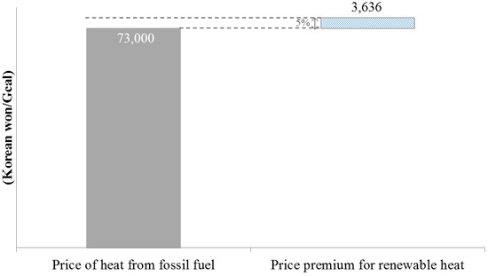Although accurate analyses have not yet been performed, the costs of providing RH are estimated to be approximately twice the cost of providing heat from fossil fuel. In other words, the additional WTP or the price premium for RH over heat that is produced from fossil fuels is much lower than the additional costs of providing RH instead of heat that is produced from fossil fuels. Without the government’s financial support, the provision of RH does not appear to have financial feasibility. Thus, the government should financially support the RH provision if it is necessary to increase the provision of RH. In this regard, the South Korean government considered the RH expansion policy in the Second National Basic Plan for Energy (2015–2035) that was announced in 2014. For example, the introduction of some programs, such as RH obligation, RH incentive, and feed-in-tariff for RH, was considered [12,46]. Regrettably, they were not actually introduced due to the difficulty of securing enough budget and the government’s smaller interest in heat than electricity.