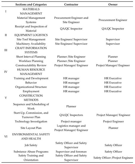 The BPPII is a metric to measure how effectively the methods, tools, and strategies known to improve construction productivity are being implemented on-site. The process of identifying various practices that positively affect productivity and improve performance at a project level can be termed as productive practices []. Over the years CII has developed a various set of best practices to improve performance on-site. The BPPII is a method containing a comprehensive list of best practices, developed to help project managers or superintendents in planning productivity-enhancing job site activities [,]. It is also a metric to measure how effectively the methods, tools, and strategies which are known to improve construction productivity are being implemented on a construction job site []. These practices were identified through an extensive literature review and in consultation with industry experts and have been proven to impact productivity positively. The practices were then grouped together into a formalized set of BPPII categories, sections, and elements. Each individual category and their elements represented a specific practice that is known to improve productivity. Identifying strong and weak practices may help to trace individual efficiency and technical change in each sector. For example, weaker sectors can learn from the stronger ones and better understand their capabilities. BPPII is designed for use at the end of the Front-End Planning (FEP) phase and at the beginning of the execution phase to support in the preparation of a Project Execution Plan (PEP). The method may be used by a construction planning team to assist in the planning and implementation of the best practices for improving craft productivity on industrial construction projects. It can also be used during the execution phase for continuous assessment and improvement.